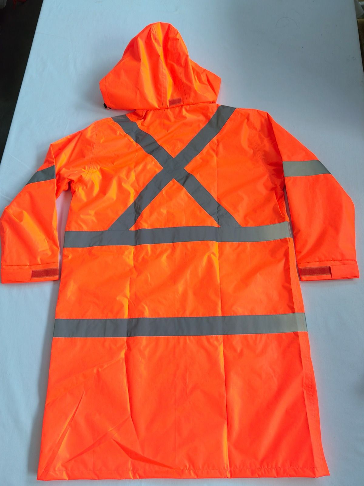 Waterproof ¾-length raincoat in high-visibility orange with full reflective tape and storm hood. Built for safety and comfort in low-light, wet site conditions.